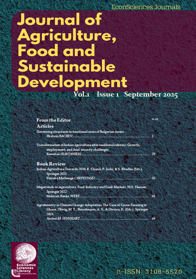 JAFSD (3108-5520) is a peer-reviewed open access journal focusing on research in the agricultural and food sciences. The journal welcomes full length research articles, reviews, short communications, perspectives, and commentaries from researchers in academic institutions, international research centers, and public and private research organizations. The journal has a special interest in the research that links agriculture and food together, and editors will prioritize to publish papers in this interdisciplinary field. Journal of Agriculture, Food and Sustainable Development adheres to strict ethical publication guidelines and actively supports a culture of inclusive and representative publication. The "Journal of Agriculture, Food and Sustainable Development" is aimed at a broad audience of academics, policymakers, practitioners, and other stakeholders interested in the intersection of agriculture, food, and sustainable development. The journal provides a valuable resource for researchers seeking to publish their work, policymakers seeking evidence-based guidance, and practitioners seeking innovative solutions to real-world challenges. Continuous Publication Model: Econsciences Journals is published under the continuous publication model.