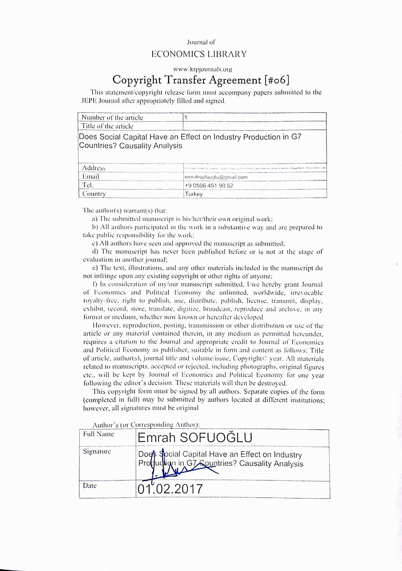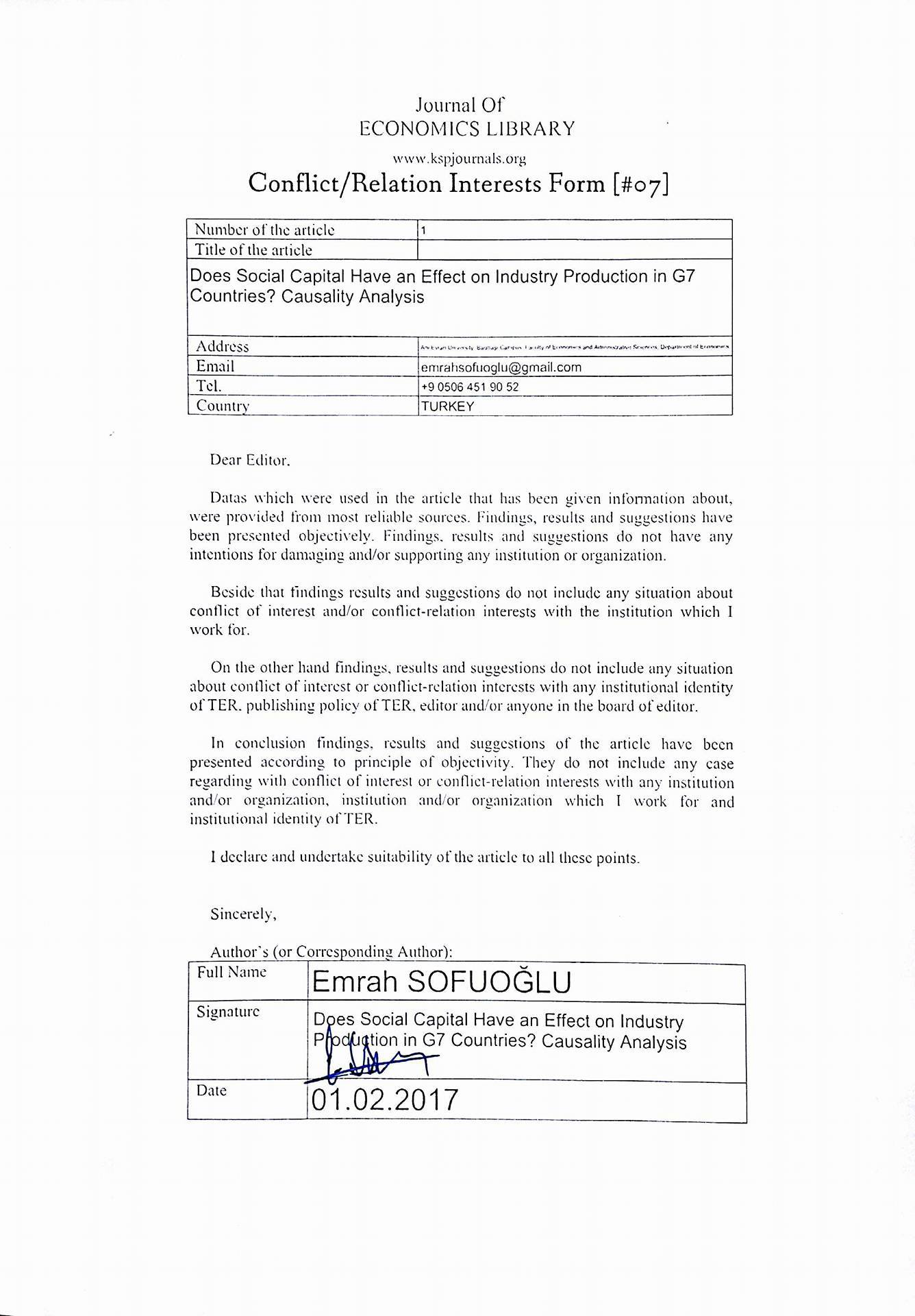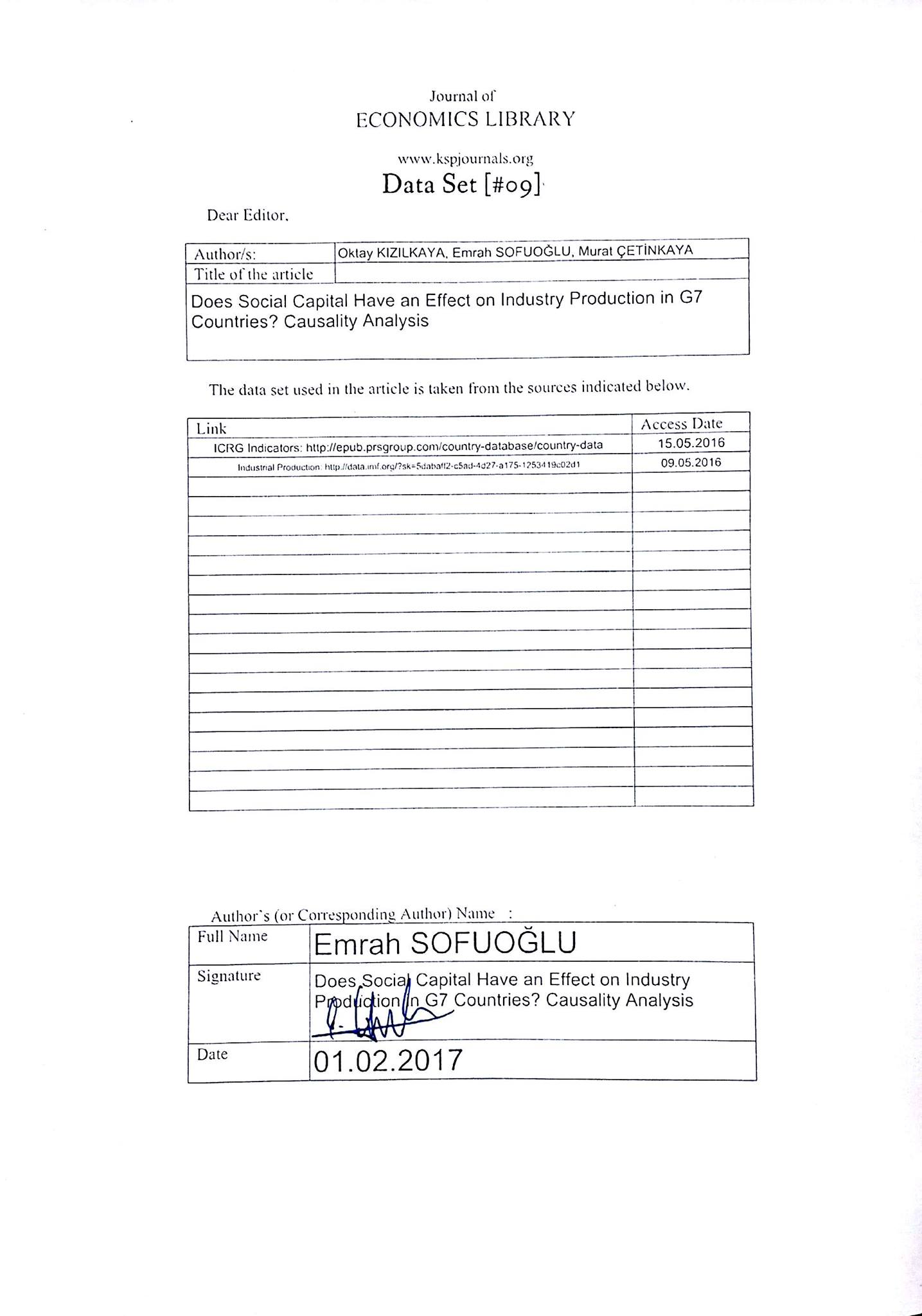 Keywords. Social capital, Industry production, Economic growth, Panel causality, G7 Countries.