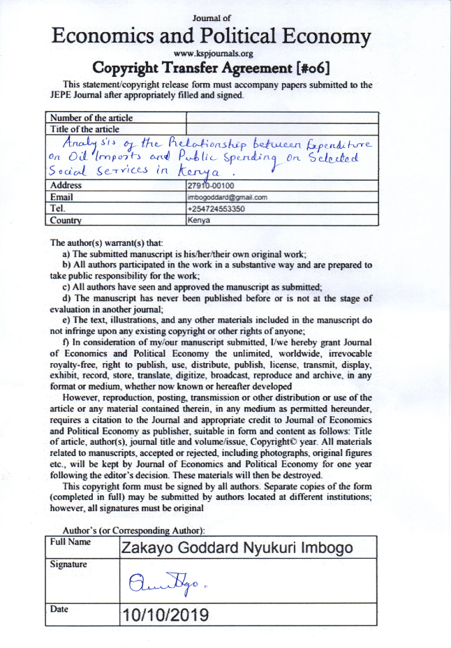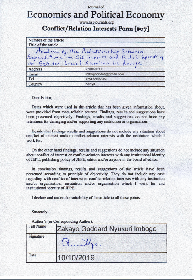 Abctract. Since independence, oil imports in Kenya have been rising mainly to sustain the nascent transport, manufacturing, energy, agriculture and maritime sectors among other uses in the country. The growth in the country’s oil import bill has however been closely related to public spending in the health and education sectors which experienced shocks owing to the growth in expenditures apportioned to the rising volume of oil imports. Given the significance of the social pillar of the Kenya Vision 2030 and the inconsistency in the progress towards achieving the Sustainable Development Goals, which is inherent in the Kenya Vision 2030, understanding the linkages between the aforementioned trends in expenditures can help in explaining the progress towards attaining the education and health facets of the social pillar. The purpose of this study was to analyze the relationship between aggregate expenditure on oil imports and public spending on health and education. The data used was time series data sourced from Kenya National Bureau of Statistics, Central Bank of Kenya and World Bank. The study employed granger causality and correlation analysis. Based on standard Chi-square tests and F-tests, the findings of the study revealed that there exists bi-directional causality between government expenditure on health and aggregate expenditure on oil imports on one hand; and a unidirectional causality running from government spending on education to aggregate expenditure on oil imports on the other hand, both in the long-run and short-run. It is therefore recommended that the government should define what is deemed economically sustainable in regard to government expenditure on health as a proportion of the exchequer budget. It should also put in place policies that will institute reasonable margins for government expenditures on health and education to adjust as a measure to keep the rising oil import bill in check.