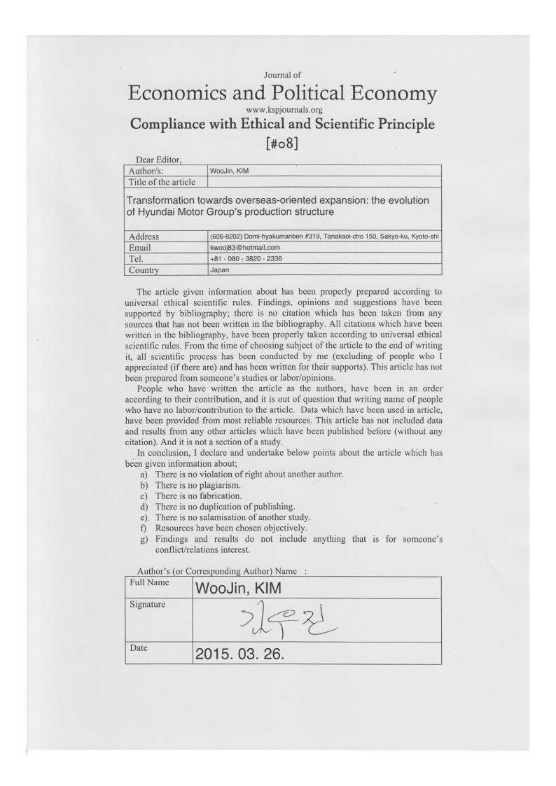 Keywords. Corporate system, Production structure, Automobile industry, Hyundai Motor Group, Evolutionary transformation.JEL. F23, L 11, L62, M21.