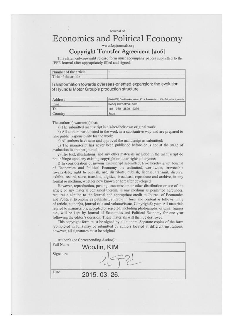 Kim, W.J (2014a). An institutional economic approach to the low-cost production system: the wage-labour nexus in Hyundai Motor Group. Evolutionary and Institutional Economics Review, 11(1), 19-40.doi:10.14441/eier.110102